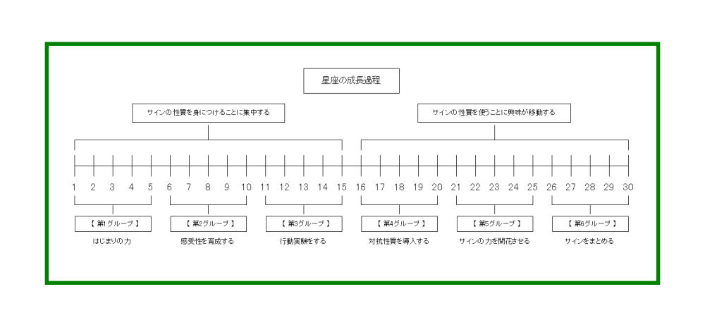 どの星座もひとつの星座は30度あり、それを5度ずつ6つのグループに分けて見ることで、それぞれの星座がどんな過程を経て成熟していくのかを、より詳しく知ることができます。