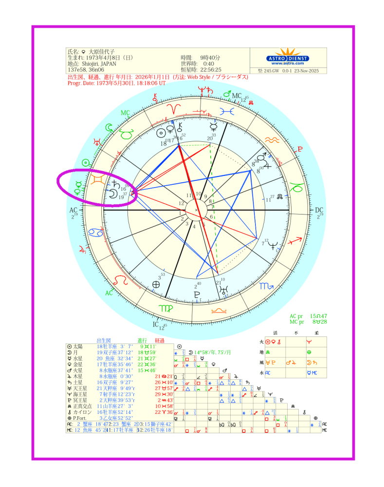 私が生まれたときの冥王星と、2026年の冥王星はトラインの関係です。トラインはエネルギーの高揚や加速を促し、調和や幸せをもたらすとされるアスペクト。