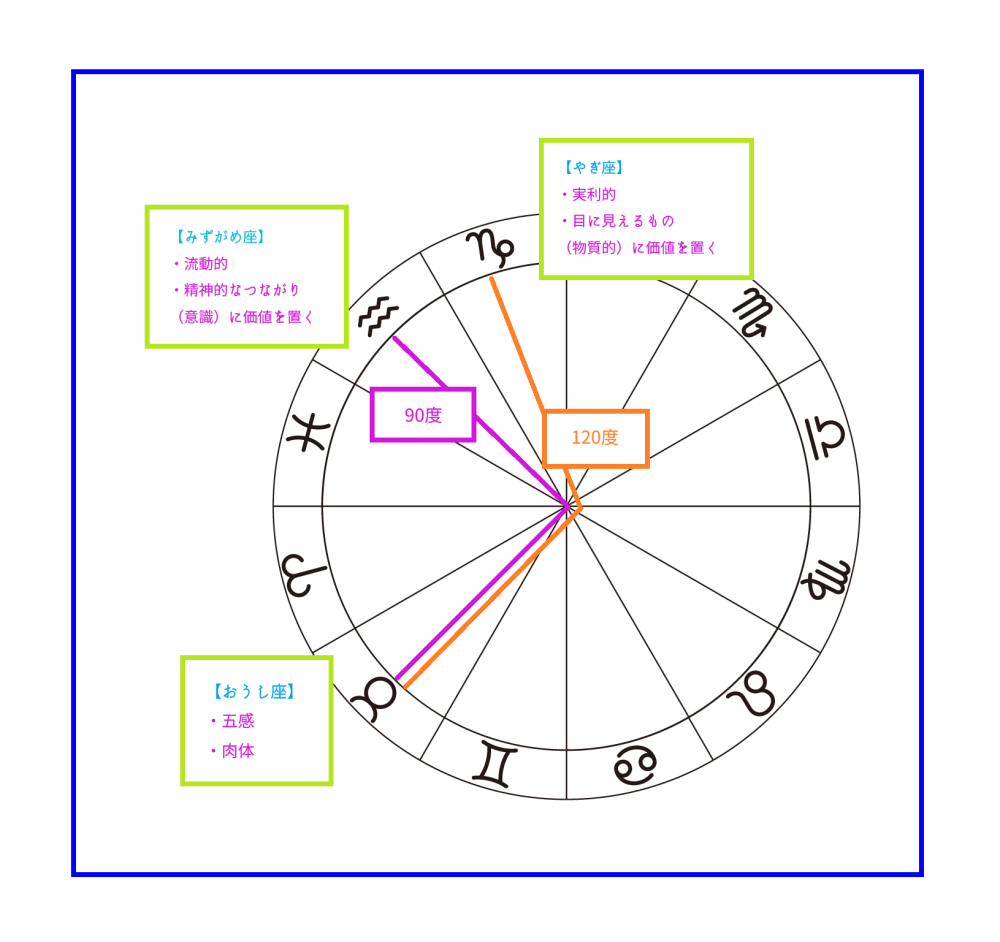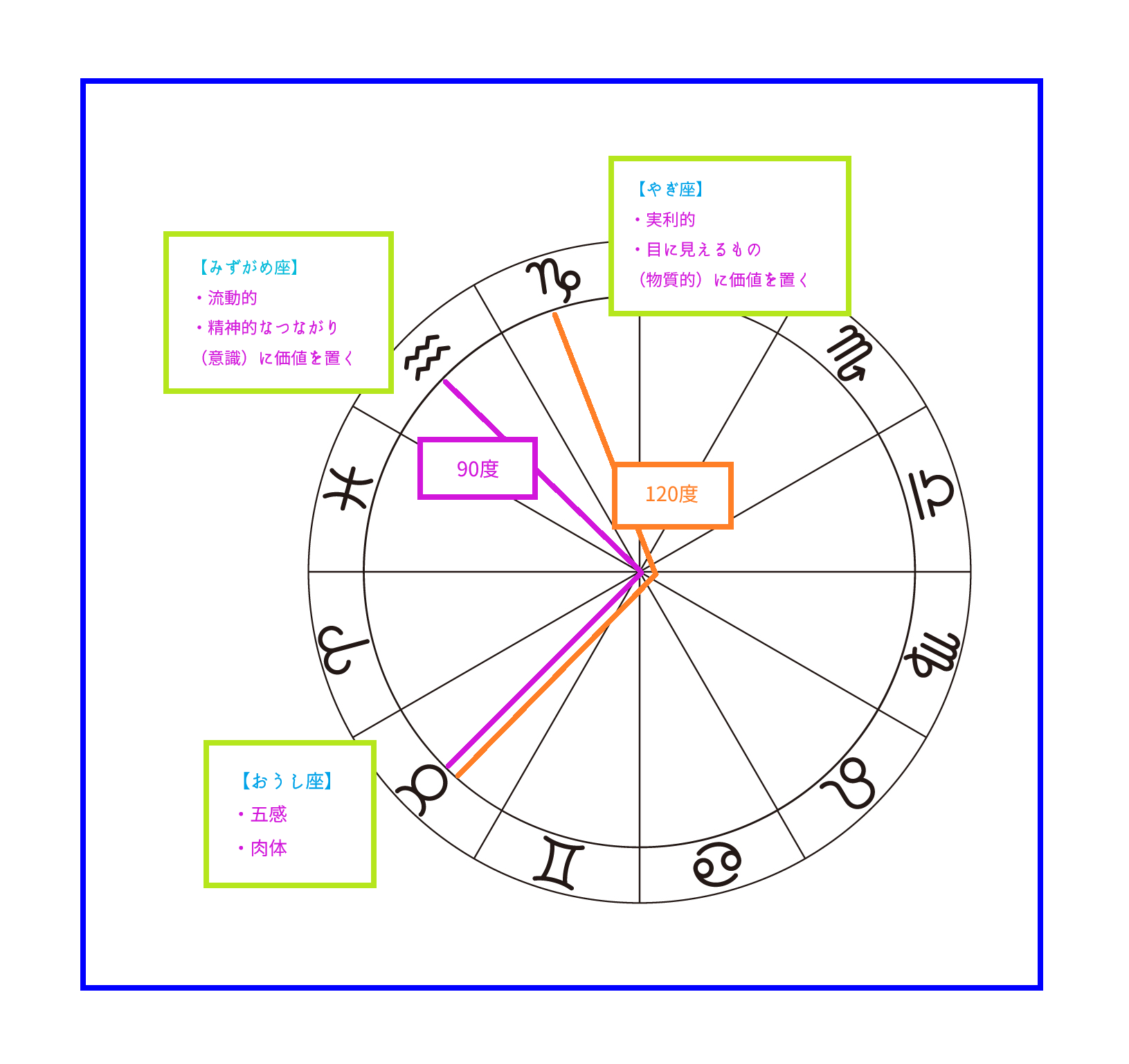 おうし座はみずがめ座に対して90度の位置にいます。この角度は予想もしていなかった方向に進路を取らせます。