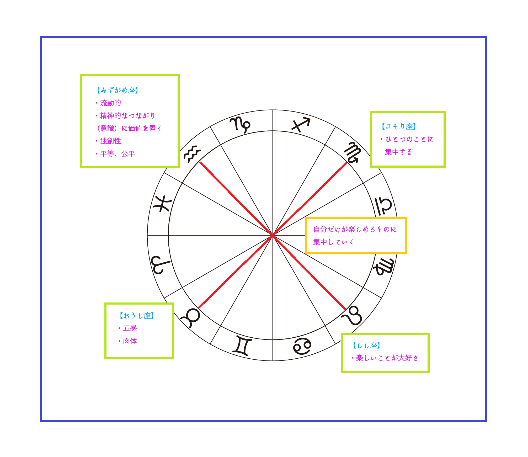 ここにおうし座の五感とみずがめ座の独創性が加わることで、この十文字は「自分だけが楽しめるものに集中していく」というテーマを乗せたプロペラになります。